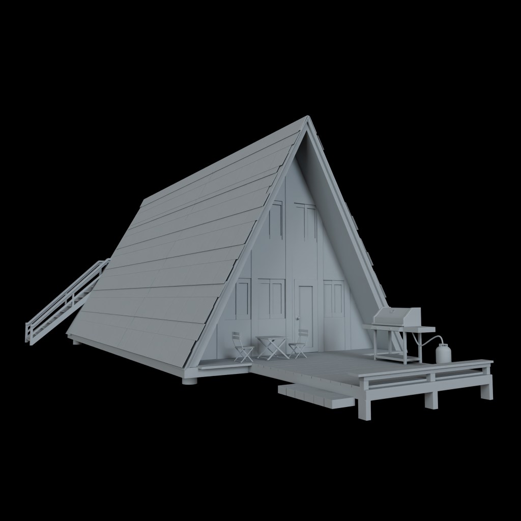 All of the assets of the cabin, BBQ, deck, stairs, furniture and mountains were all modelled by myself. The mountains were height fields made within Houdini while the other assets were modelled in Maya.